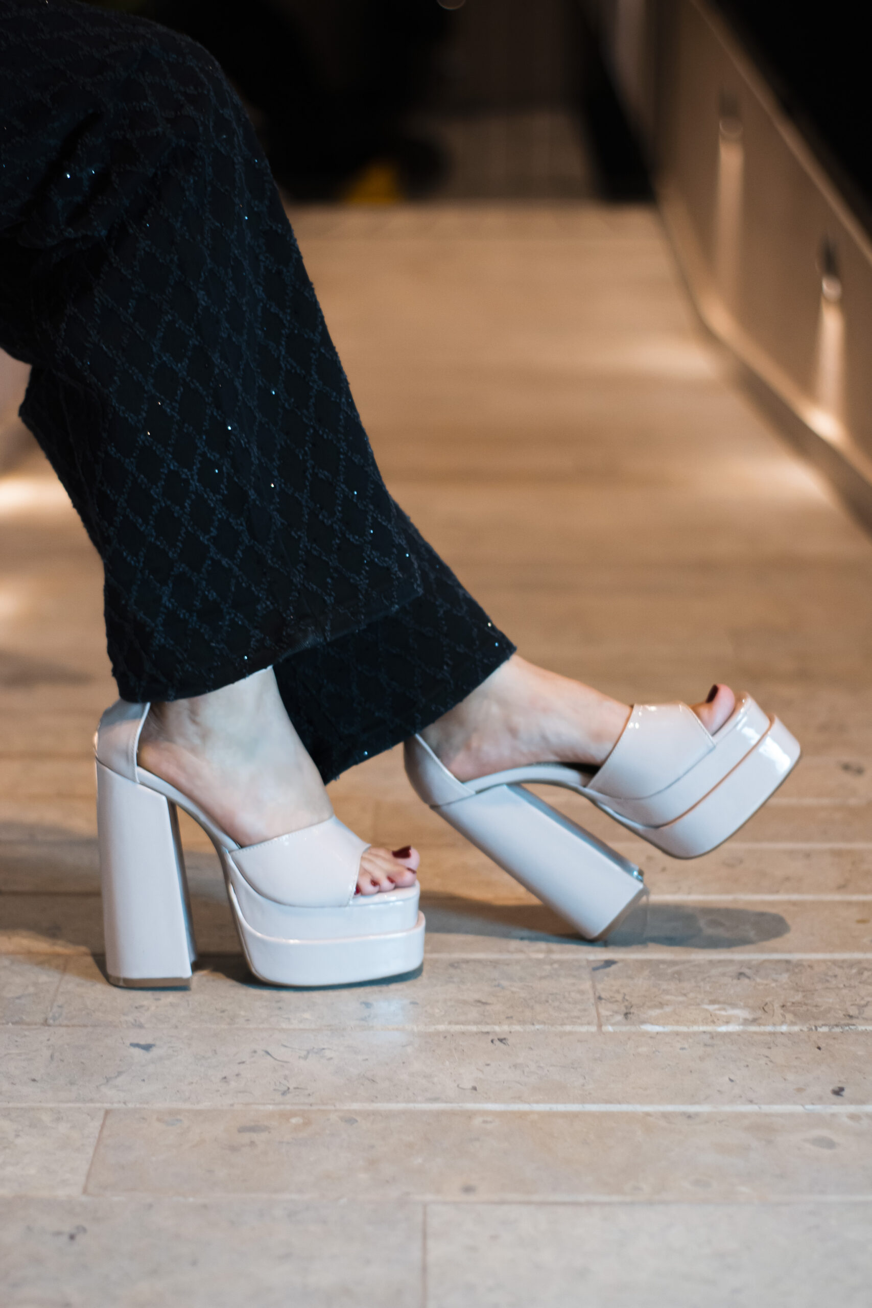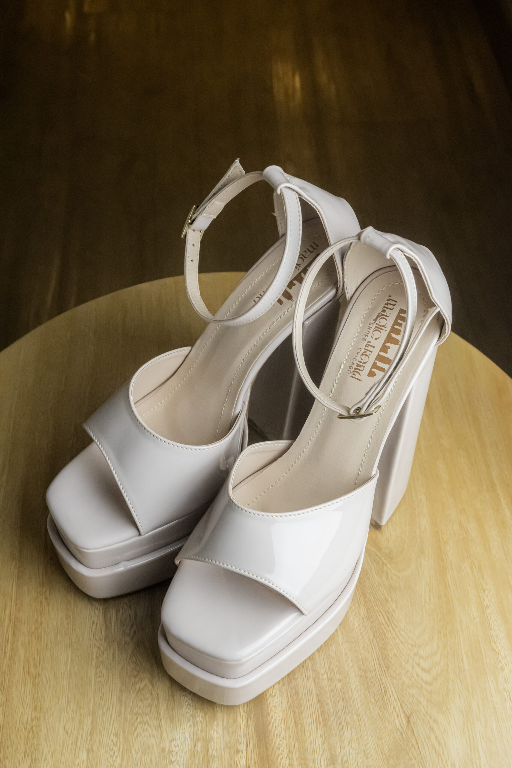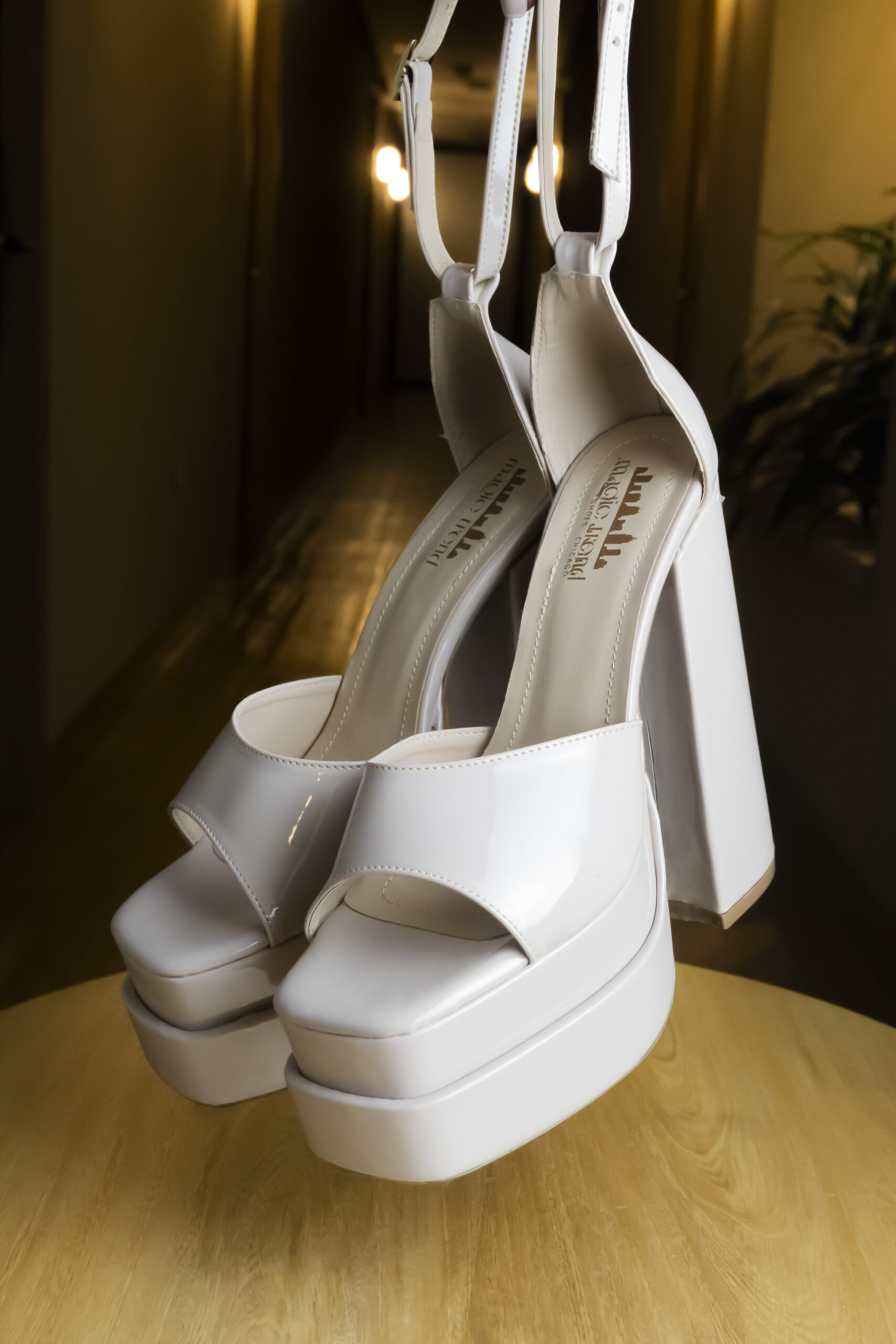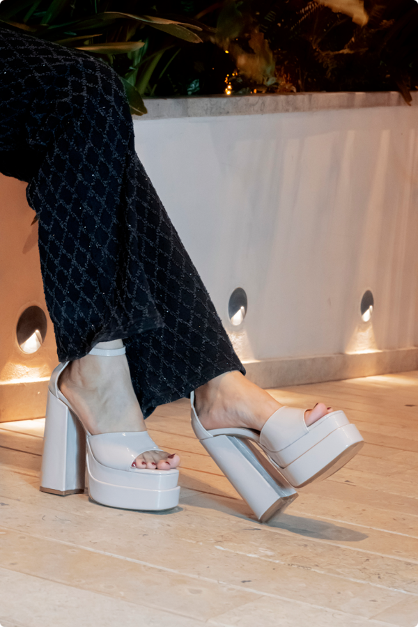 Heel featuring a support platform that provides greater stability with a 15cm height and made of patent material and handcrafted by Colombian artisans.