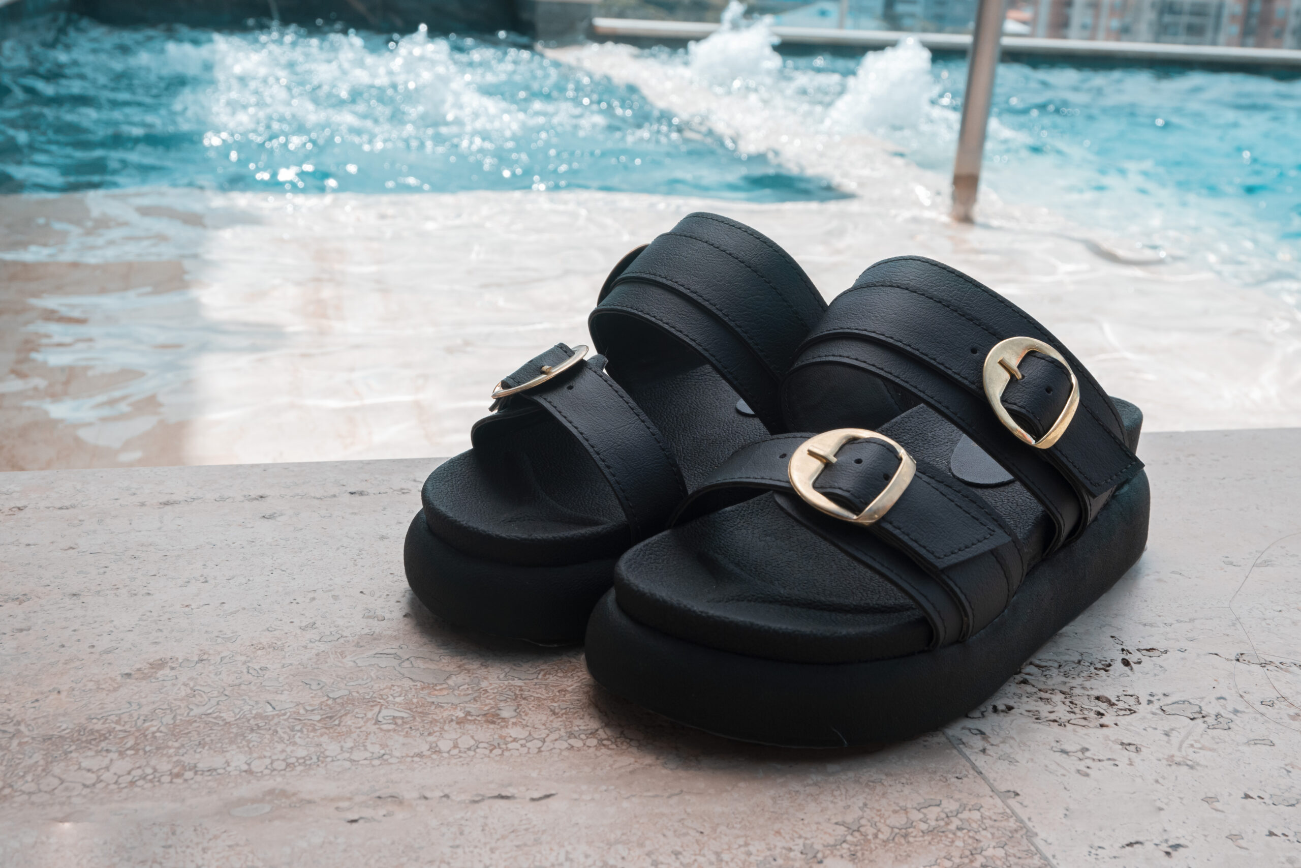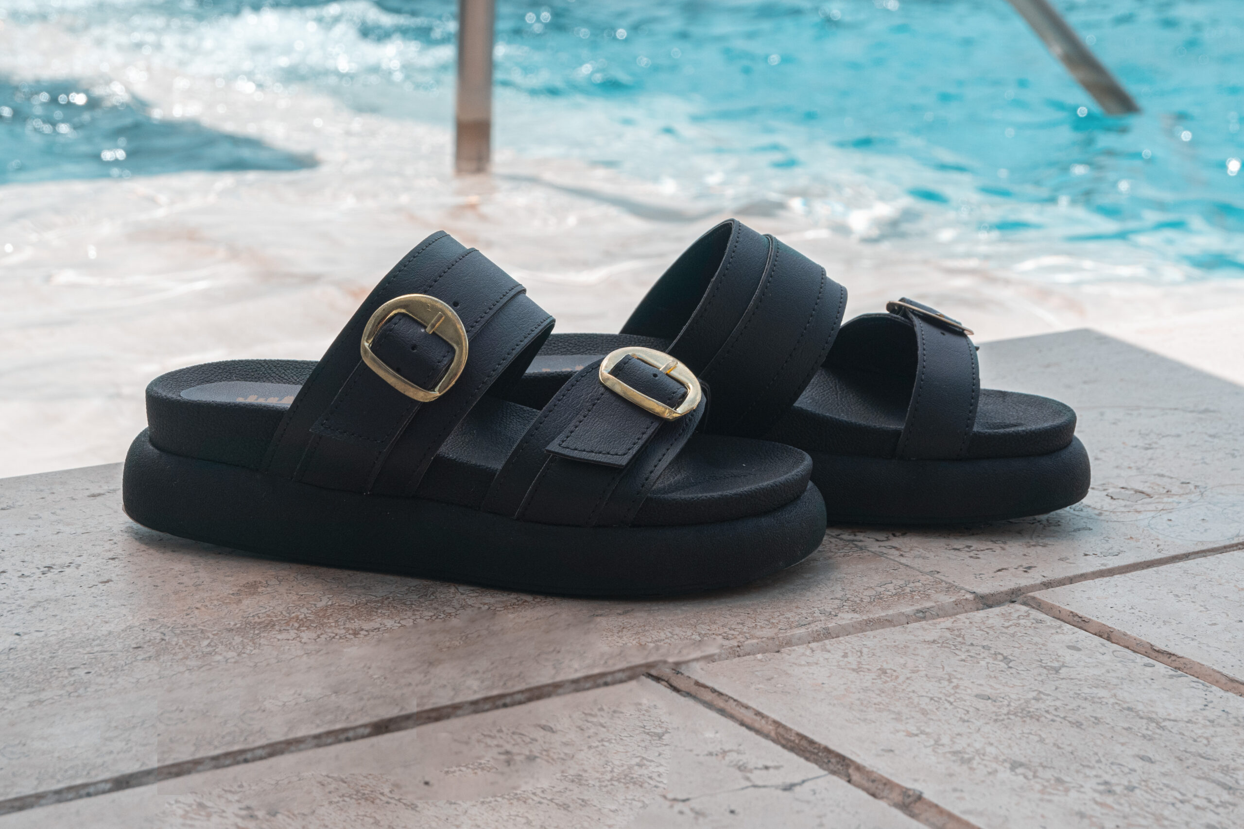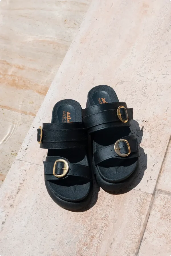 Handcrafted beach sandals made of synthetic material by Colombian artisans.