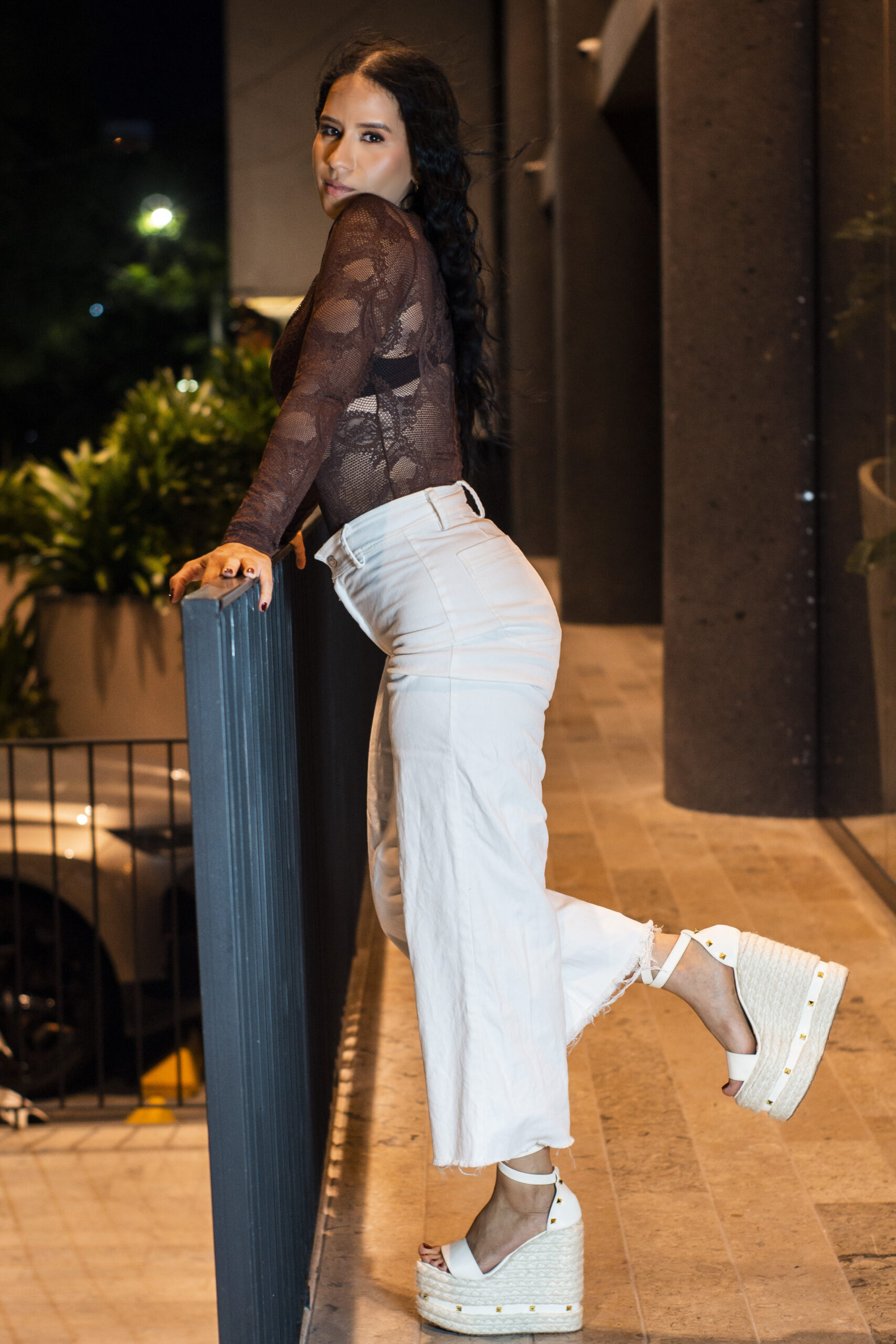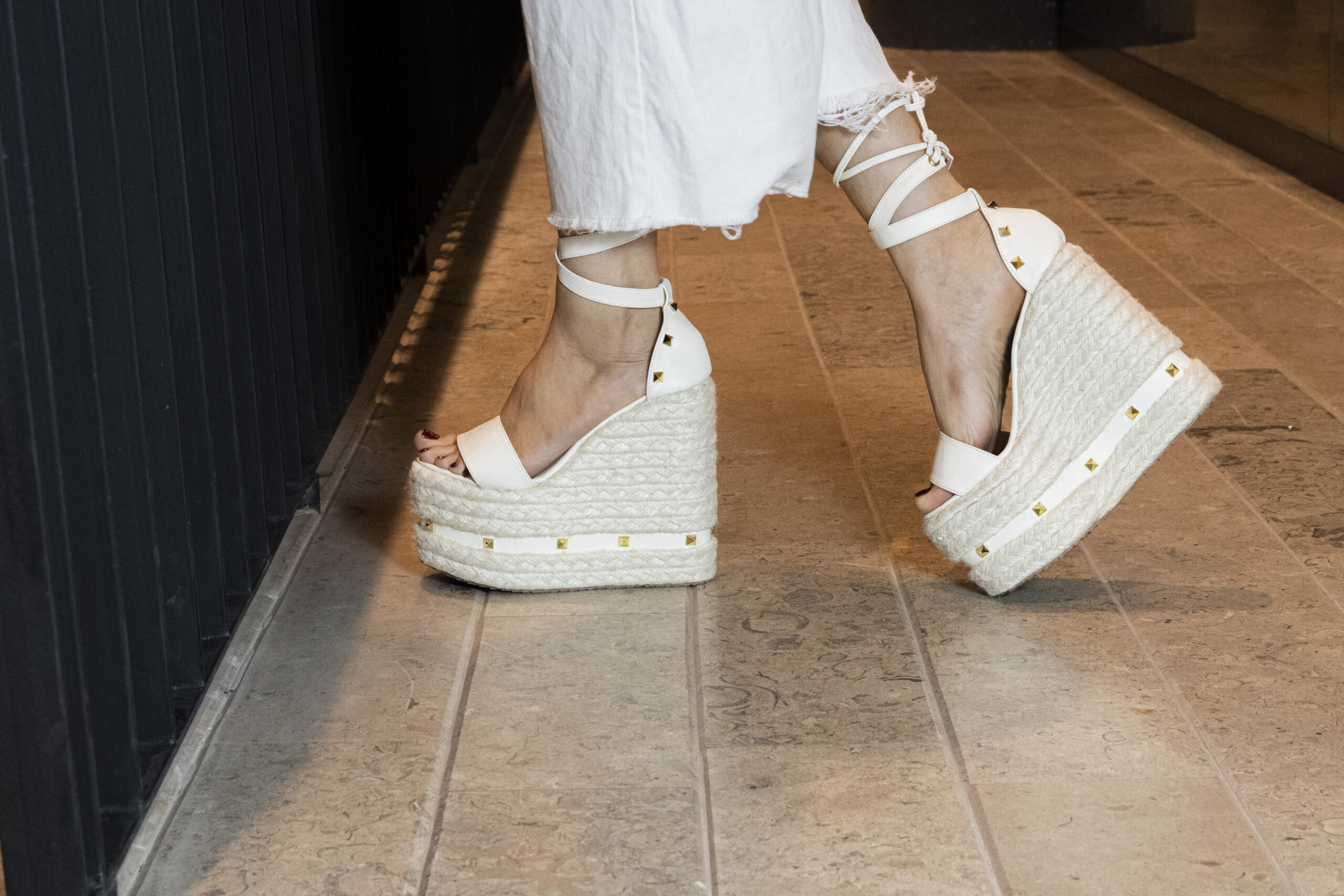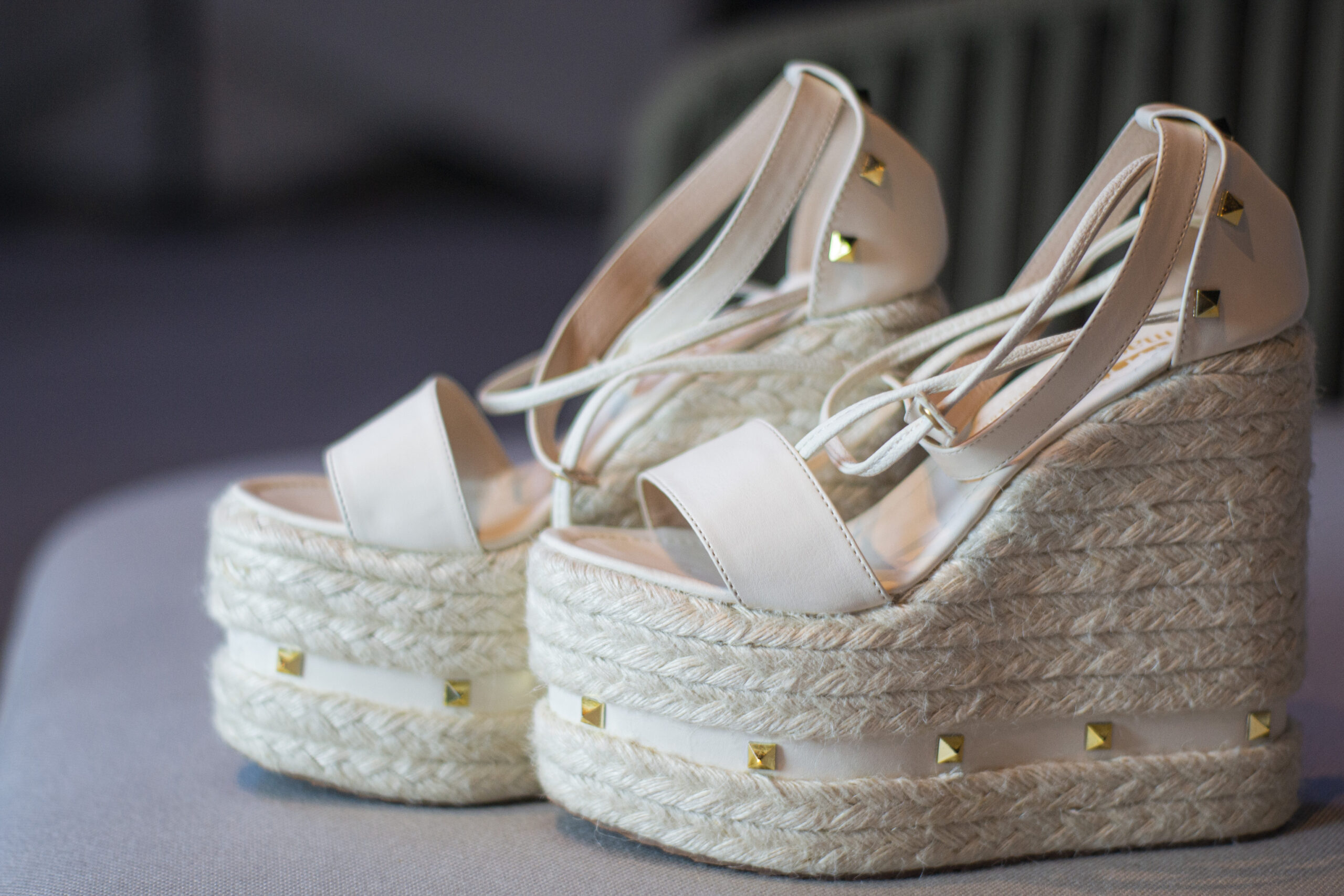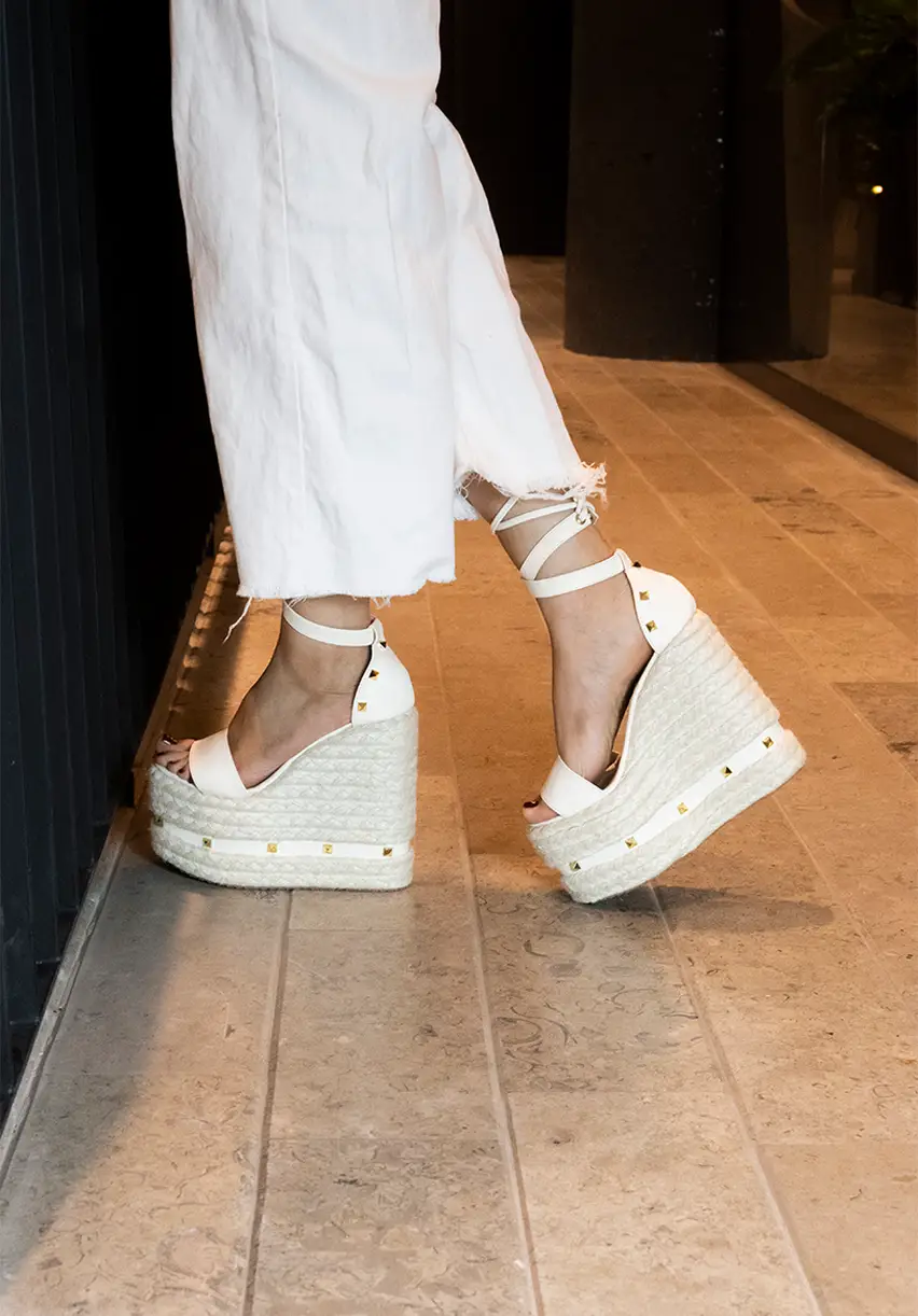 Platform heel with a 15cm height, made of synthetic material, artisanal jute and gold details, handcrafted by Colombian artisans.