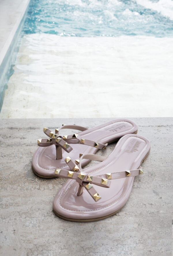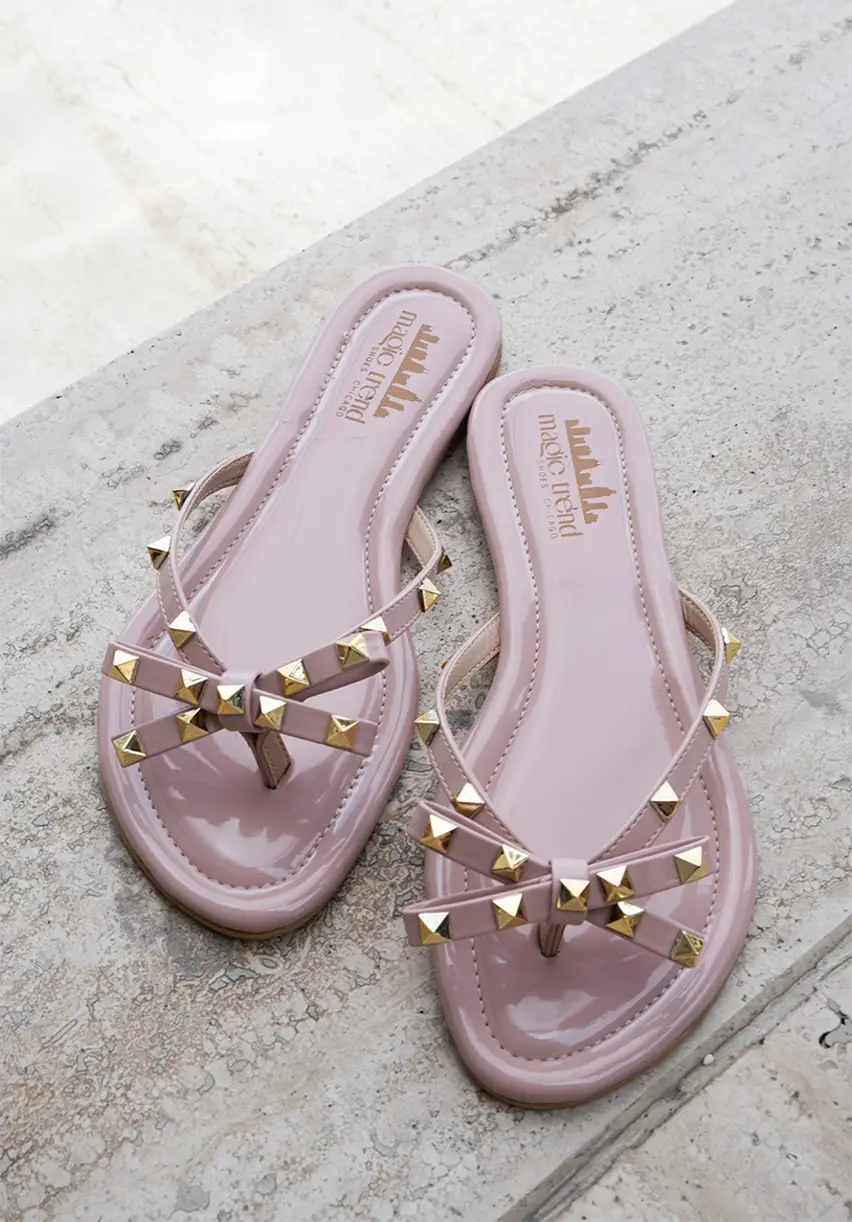 Flat sandal made of synthetic material with gold details, handcrafted by Colombian artisans.